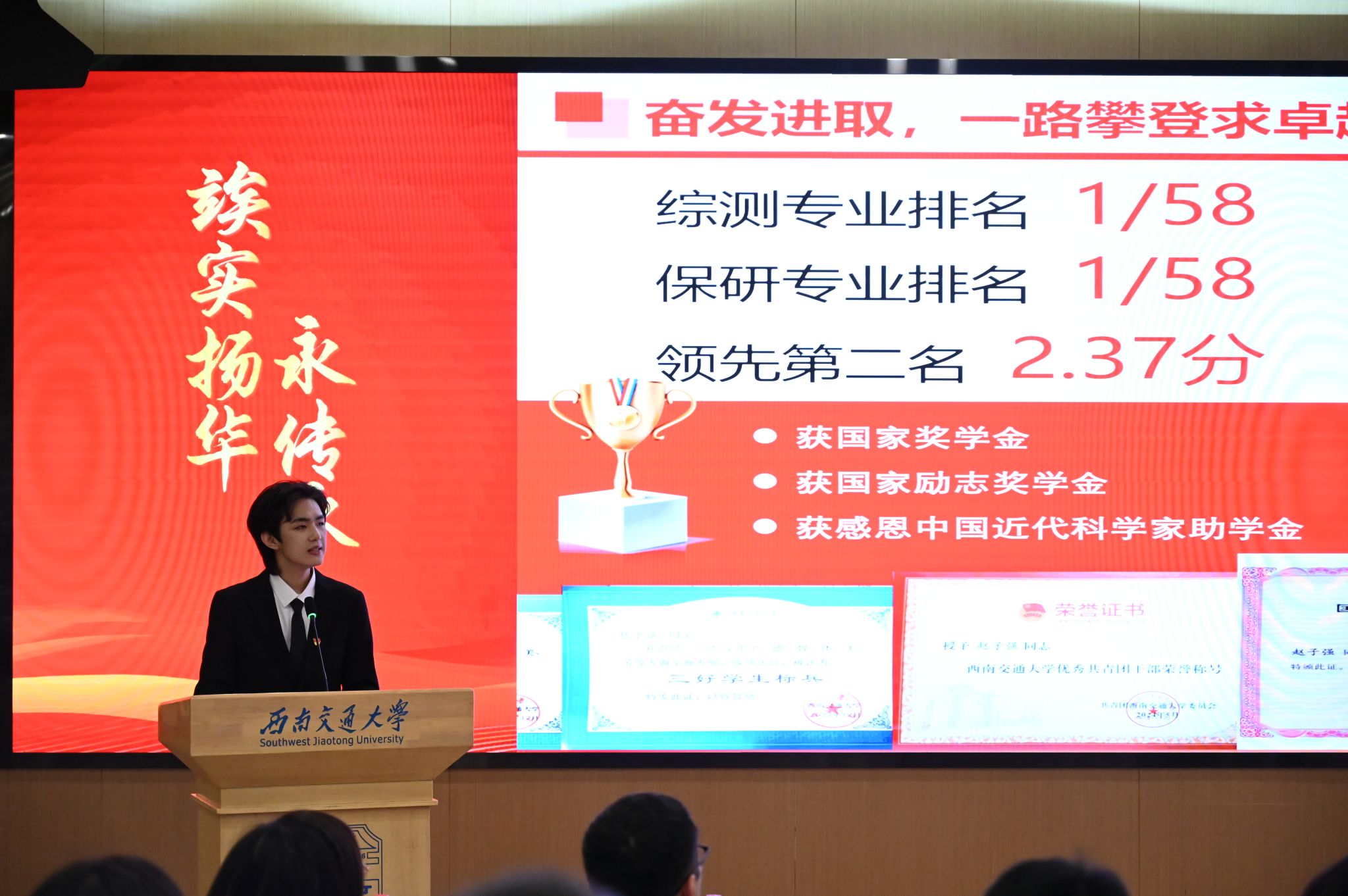 在观摩“竢实扬华奖章”评选展示会后,“红志”班学员罗海同学分享观后感,表示:“竢实扬华”奖章是交大的最高个人荣誉,代表了“竢实扬华,自强不息”的交大精神,我作为评选展示会的一名观众,非常有幸能见识各学院大佬神仙打架,非常荣幸能见证“竢实扬华奖章”获得者的诞生。候选人们的精彩展示,不仅展现了他们在学业、科创、学生工作各方面的卓越才能,更彰显了交大学子的精神风貌。他们的成长故事激励人心,更让我深刻理解了“竢实扬华,自强不息”的交大精神,它激励着一代代学子精勤奋斗,锐意进取,超越自我。