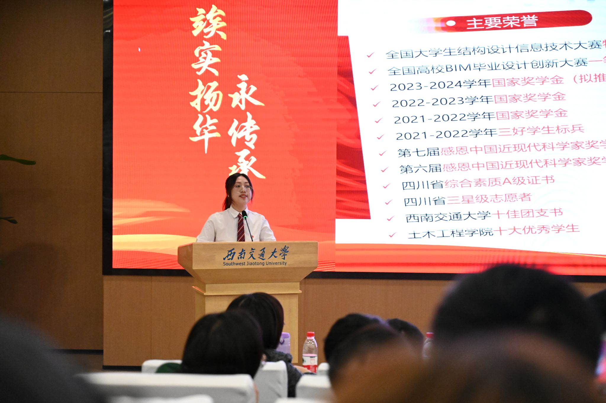 2024年11月18日下午14:00,“竢实扬华奖章”评选展示会在犀浦校区图书馆一号报告厅举行,土木工程学院2021级本科生肖岚芝同学和赵子强同学作为候选人参与答辩。其中,肖岚芝同学成功当选为2024年“竢实扬华奖章”(本科生)拟推荐人选。