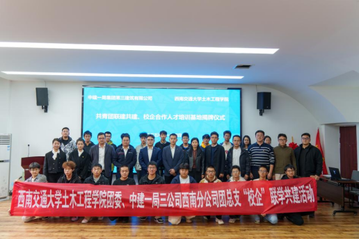 为深入贯彻落实习近平总书记关于“深化产教融合、校企合作”的重要指示精神,扎实推进人才链、创新链与产业链深度融合,11月4日,中建一局三公司西南分公司团总支与西南交通大学土木工程学院团委联合开展“校企”联学共建活动。中建一局三公司党建工作部、色情导航部、工会工作部副主任、团委书记田春雨一行到访学院,学院党委副书记刘萍及辅导员代表出席活动。