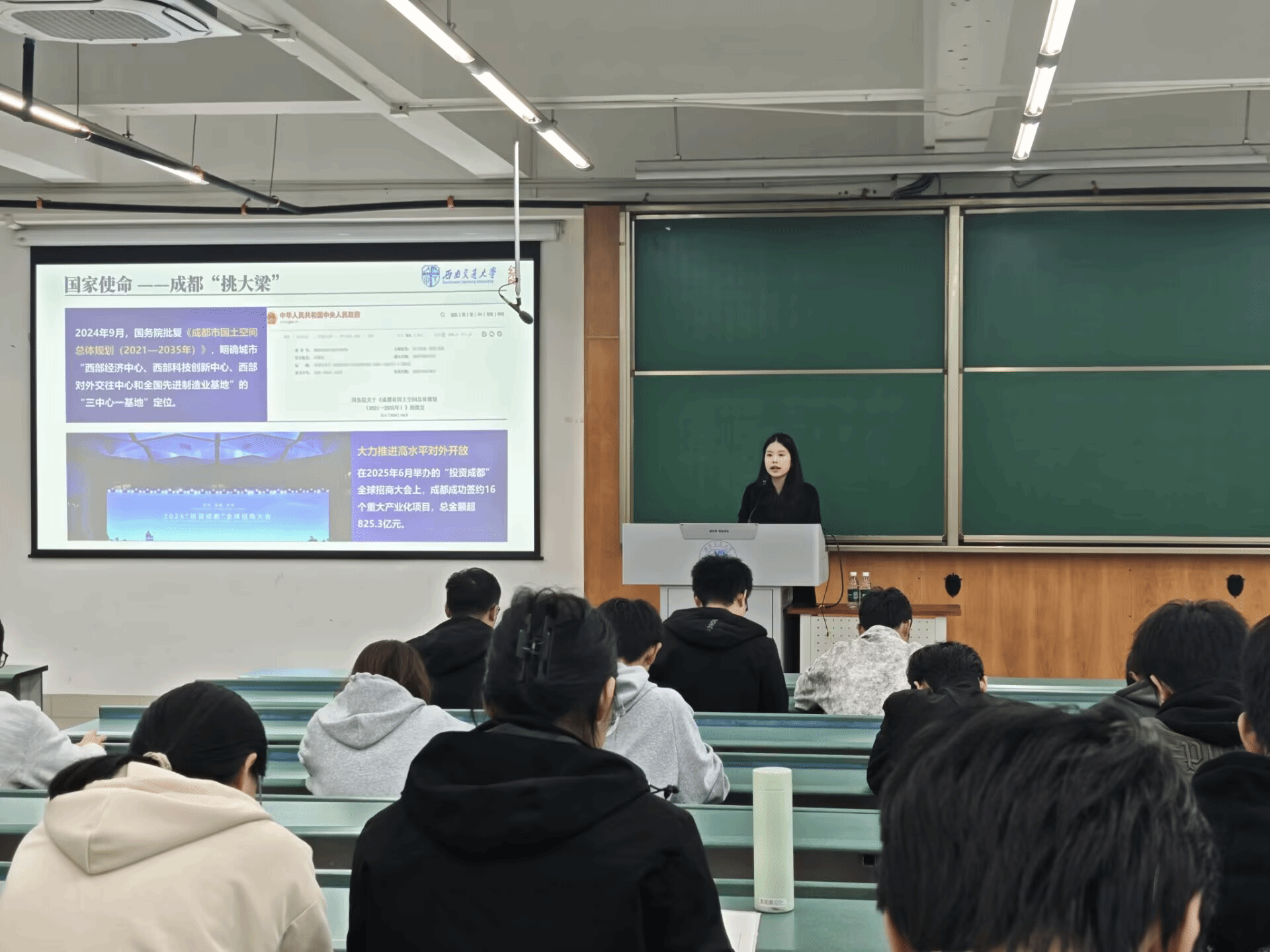 随后,高田讲师围绕“‘十四五’科技赋能,绘就发展新图景”这一核心主题,为同学们展开了深入的讲解。她首先对2025年10月党的二十届四中全会所通过的“十五五”规划进行了细致的解读,阐明了规划中“以科技创新引领新质生产力”这一重要发展方向。同时,她还详细介绍了西南交通大学在轨道交通领域的深厚科研积累,生动展现了高校在川藏铁路攻坚等国家重大工程项目中所展现出的责任与担当。她还以成渝地区为例,具体讲述了近五年来成都市在构建“空中丝绸之路+国际陆海联运”双走廊方面所取得的显著成果。
