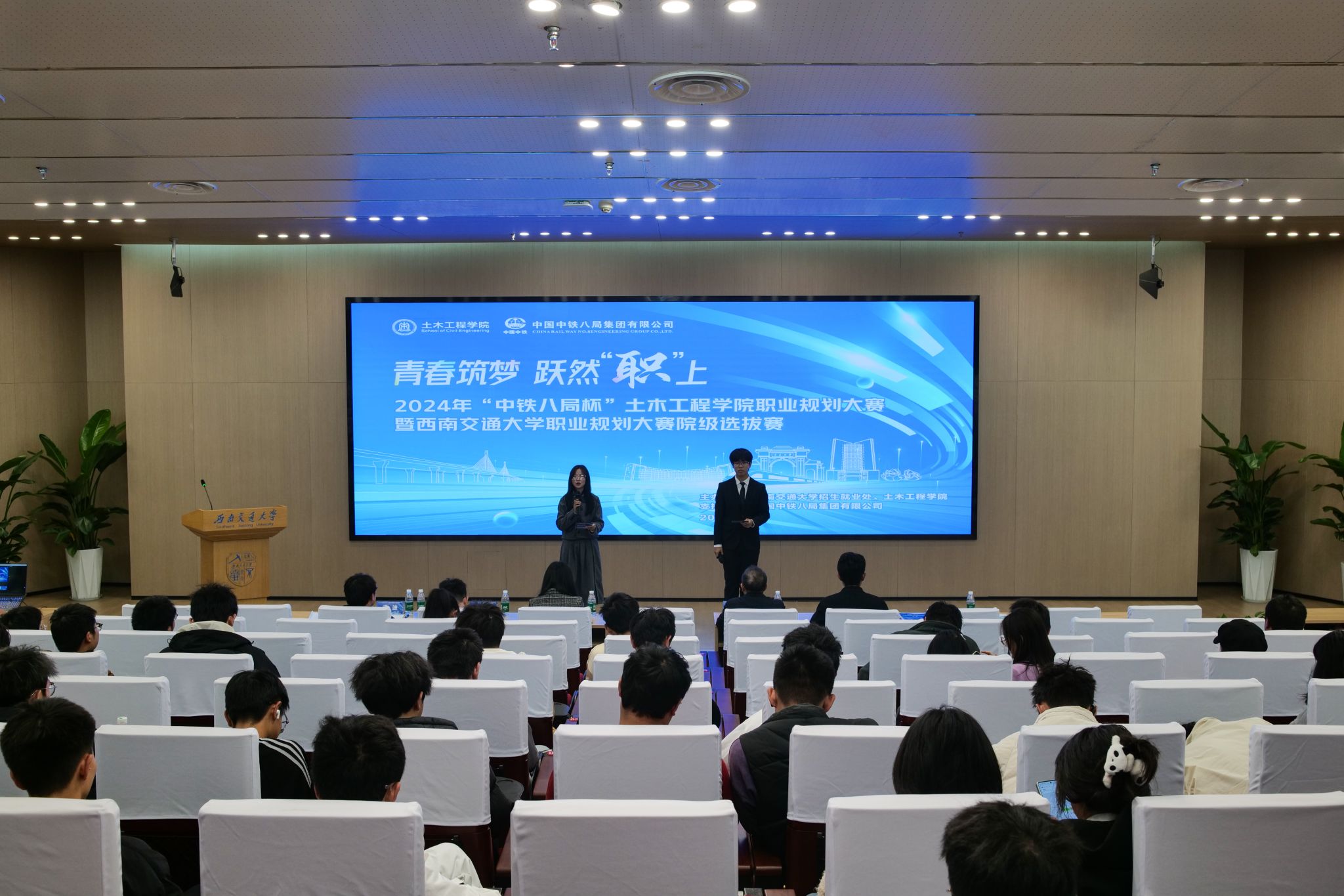 “青春筑梦,跃然“职”上”——2024年11月23日14点,2024年“中铁八局杯”土木工程学院职业规划大赛在西南交通大学犀浦校区图书馆二号报告厅顺利举行。本次大赛作为学校职业规划大赛院内选拔赛,旨在引导大学生树立正确的成才观、就业观和择业观,科学合理规划学业与职业发展,提升就业竞争力。中铁八局城市轨道交通分公司副总经理李彪、土木工程学院党委副书记刘萍、中铁八局人力资源部何宇森及辅导员出席并担任本次大赛评委,比赛共吸引了200余名学生到场观摩。