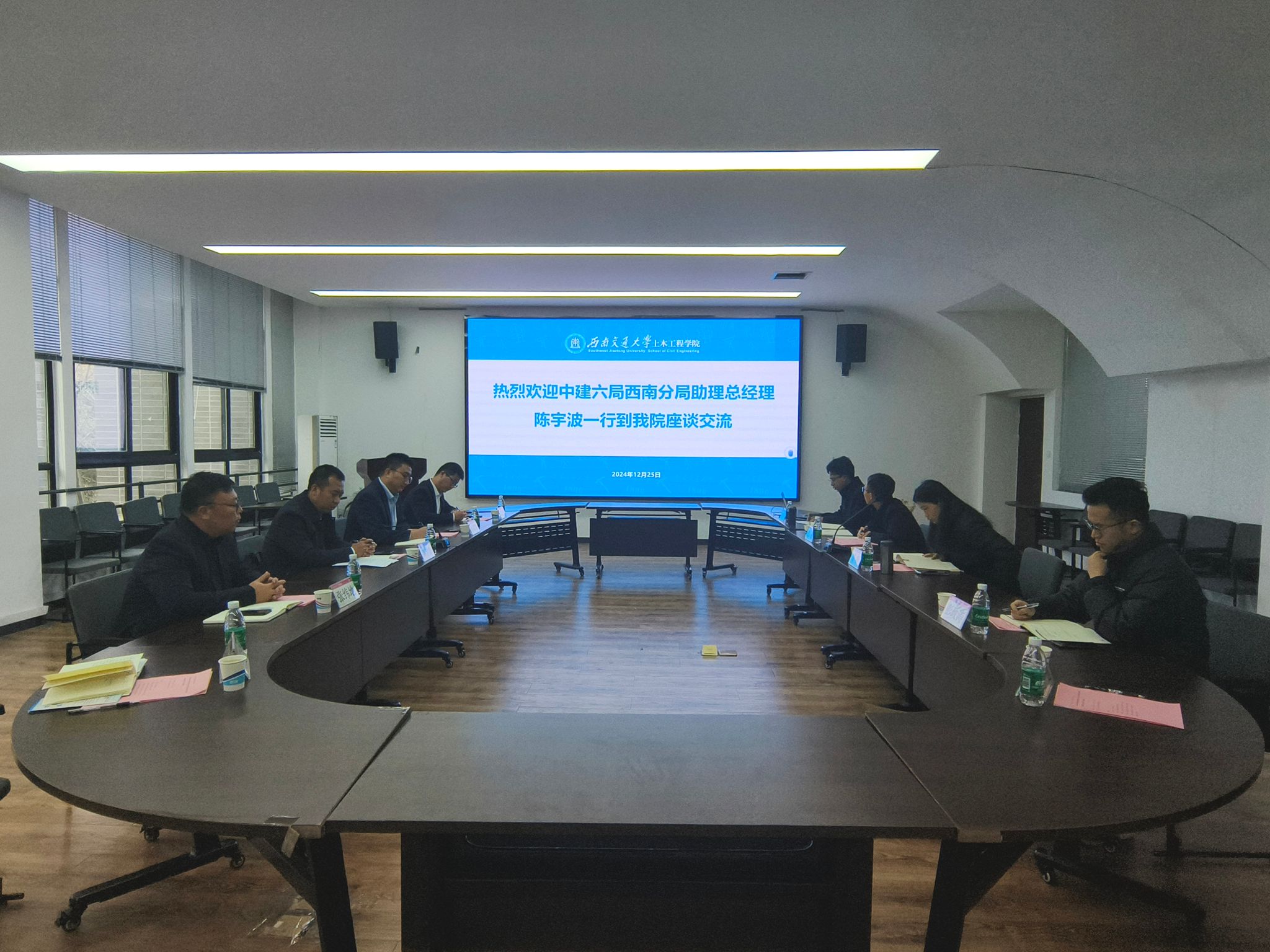 2024 年12月15日,中建六局西南分局助理总经理、第一营销部总经理陈宇波,中建六局第七建设有限公司人力资源部总经理林家辉等一行走访西南交通大学土木工程学院,并于犀浦校区4407会议室开展校企合作交流活动。土木工程学院党委副书记刘萍、学院团委副书记张进、辅导员李江怀、彭政涛、孟迪参与此次交流座谈。
