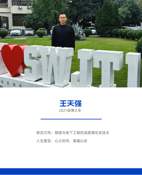 本科就读于齐齐哈尔大学土木工程专业,硕士就读于沈阳工业大学土木工程专业,博士就读于西南交通大学桥梁与隧道工程专业隧道方向。当问起王天强为什么选择读博时,他的说法是:“读博的想法是在我在硕二期间萌生,研三决定攻读博士,最终的选择是遵从内心,是兴趣使然。”