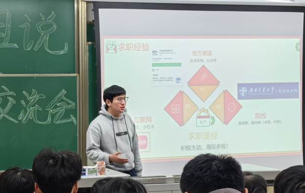 余康鑫结合自身求职经验,从个人职业规划与求职技能两个维度进行了系统分享:在职业规划方面,他建议通过个人评估明确求职目标定位;在求职技能层面,重点剖析了信息收集、资源整合、简历制作及面试应对等实用技巧。同时强调在实习过程一定要多问多看多思考,明确工作内容是否符合自己的意愿,并向身边的同事、前辈学习工作技巧和方法,为日后工作奠定基础。一定要尽早明确目标,把握方向,及时行动。