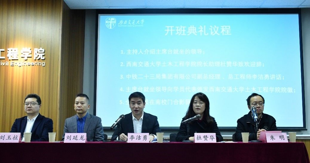 2024年1月15日上午8:20,中铁二十三局集团有限公司项目总工程师(房建专业)培训班开班典礼在九里校区土木馆举行。出席此次开班典礼的有中铁二十三局集团有限公司副总经理、总工程师李洁勇、中铁二十三局集团有限公司科学技术中心总经理刘延龙、中铁二十三局集团有限公司人力资源部经理刘玉柱、西南交通大学土木工程学院培训中心主任杜赞华,西南交通大学土木工程学院培训中心副主任朱明以及培训中心全位老师。开班典礼由我院培训中心副主任朱明老师主持。