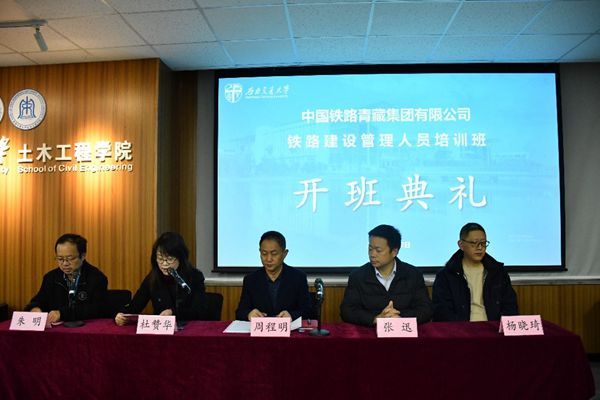 2024年3月2日上午8:20,中国铁路青藏集团有限公司铁路建设管理人员培训班开班典礼在九里校区土木馆1234教室顺利举行。主席台就坐的有中国铁路青藏集团有限公司建设部主任周程明、西南交通大学土木工程学院培训中心主任杜赞华、我院培训中心朱明副主任、我院培训中心张迅副主任及班主任杨晓琪老师。开班典礼由朱明副主任主持。