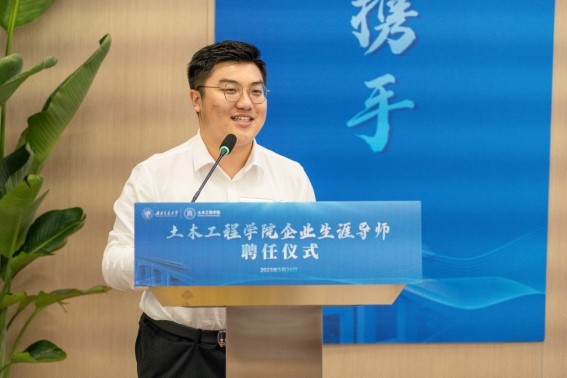 土木工程学院2020级本科生高飞作为学生代表进行了发言。高飞同学结合个人经历,回顾了企业生涯导师召开主题班会、带领班级同学前往工程建设一线参观游学、特别是新冠肺炎疫情期间企业生涯导师们的物资捐赠等难忘经历,也代表学院全体学生对各企业的支持与帮助表示衷心的感谢。