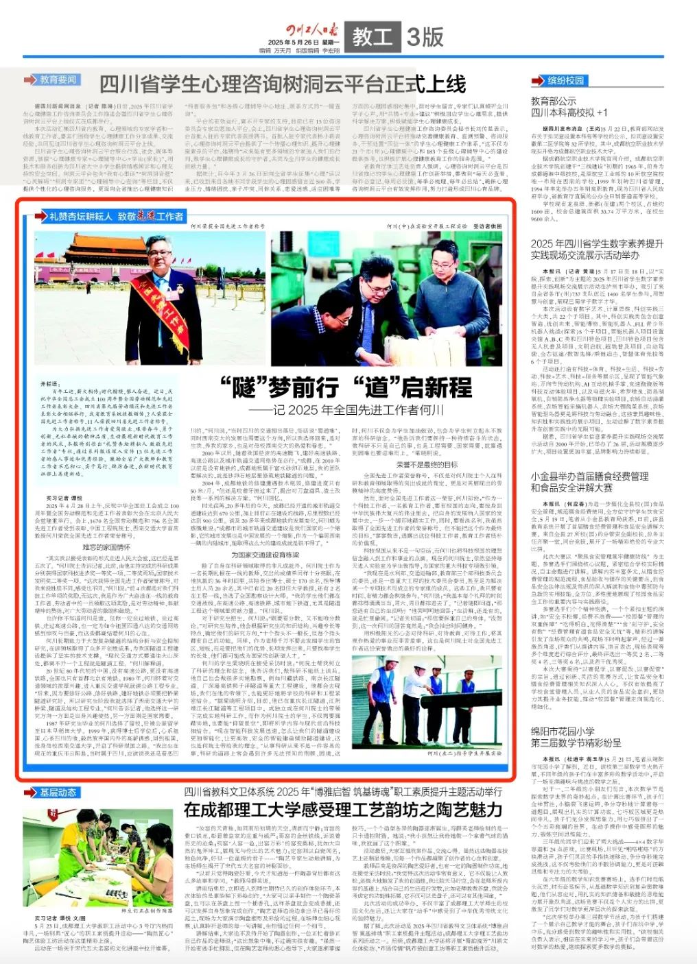 5月26日,四川工人日报以《“隧”梦前行 “道”启新程——记2025年全国先进工作者何川》为题,聚焦报道中国工程院院士、西南交通大学首席教授、2025年全国先进工作者何川。