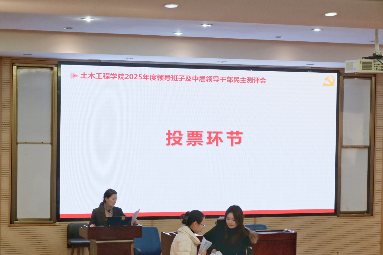 述职结束,全体与会人员以无记名投票方式,首先对副院长徐腾飞、于丽进行了试用期满民主测评,接着对学院党建工作满意度、领导班子及中层领导干部进行民主测评。测评过程严谨有序,体现了公开、公平、公正的原则。