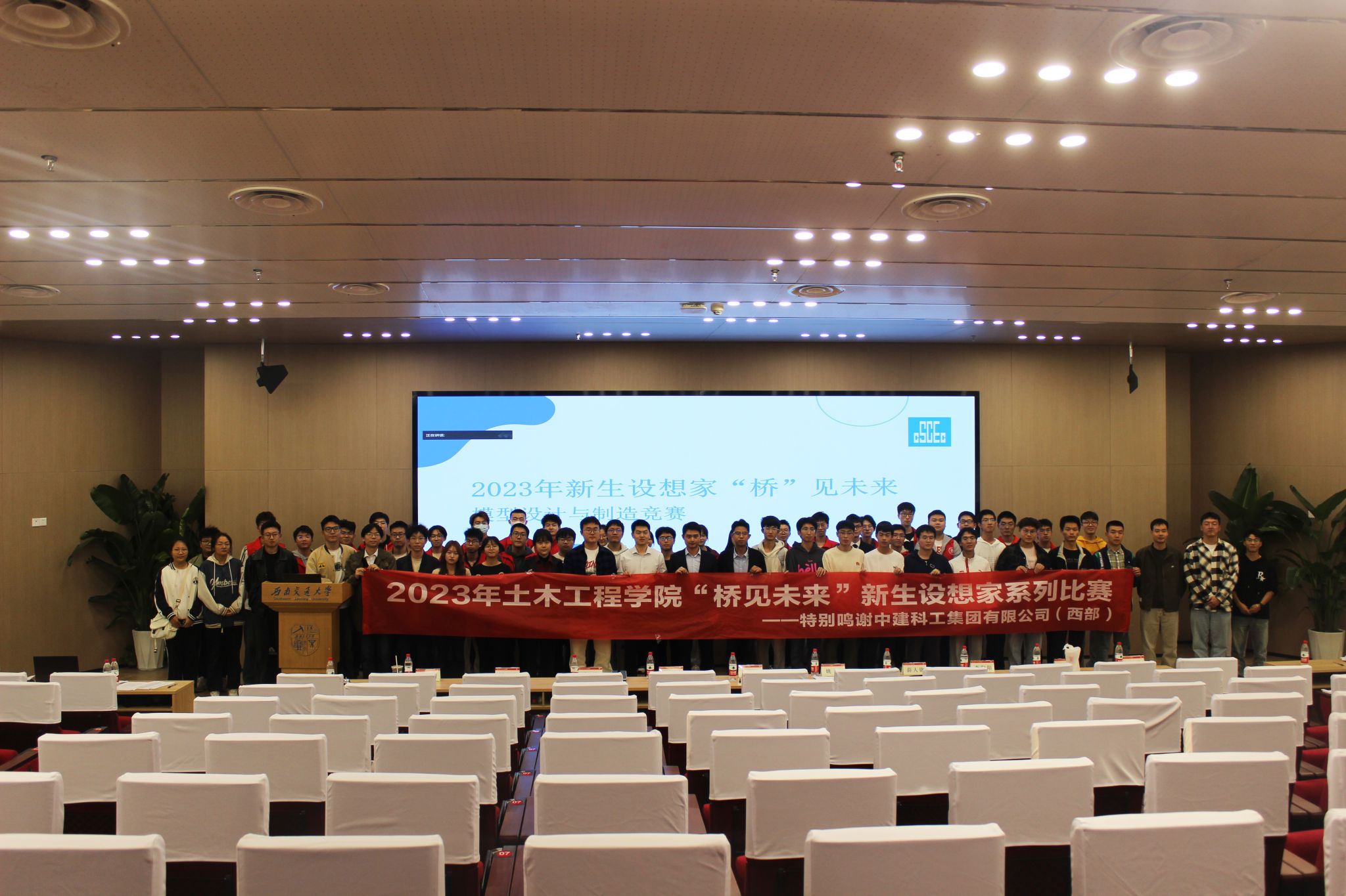2023年11月5日13时30分,由共青团西南交通大学委员会、土木工程学院主办,土木工程学院大学生科创中心承办的2023年土木工程学院“桥见未来”新生赛决赛在我校犀浦校区图书馆二号报告厅举行。中建科工四川公司天科创智项目总工程师、学院青年讲师团成员张炳宏,中建科工集团四川公司人力资源管理部人力专员姚军,学院辅导员老师李江怀,薛人铭,谢宇清,贾璇琦,李策,郭哲维,李阳阳出席决赛现场。