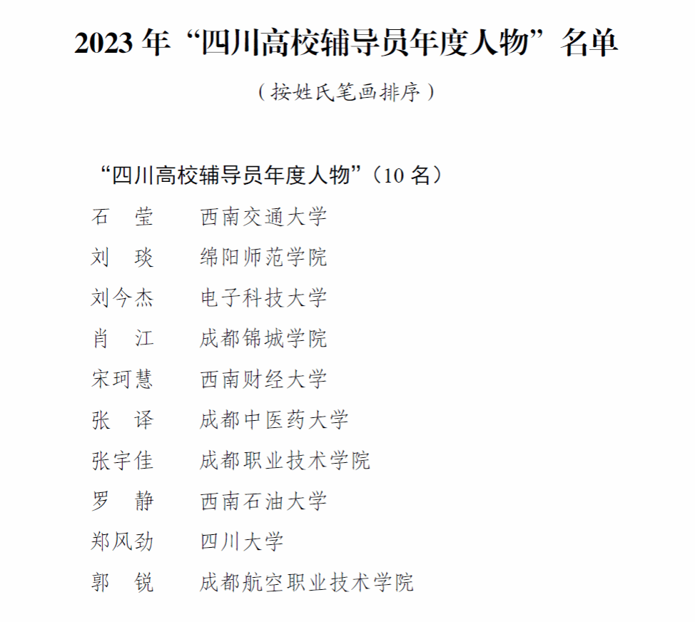 近日,由四川省教育厅主办的2023 年思政工作“年度人物”遴选结果揭晓,土木工程学院辅导员石莹老师获评“四川高校辅导员年度人物”。
