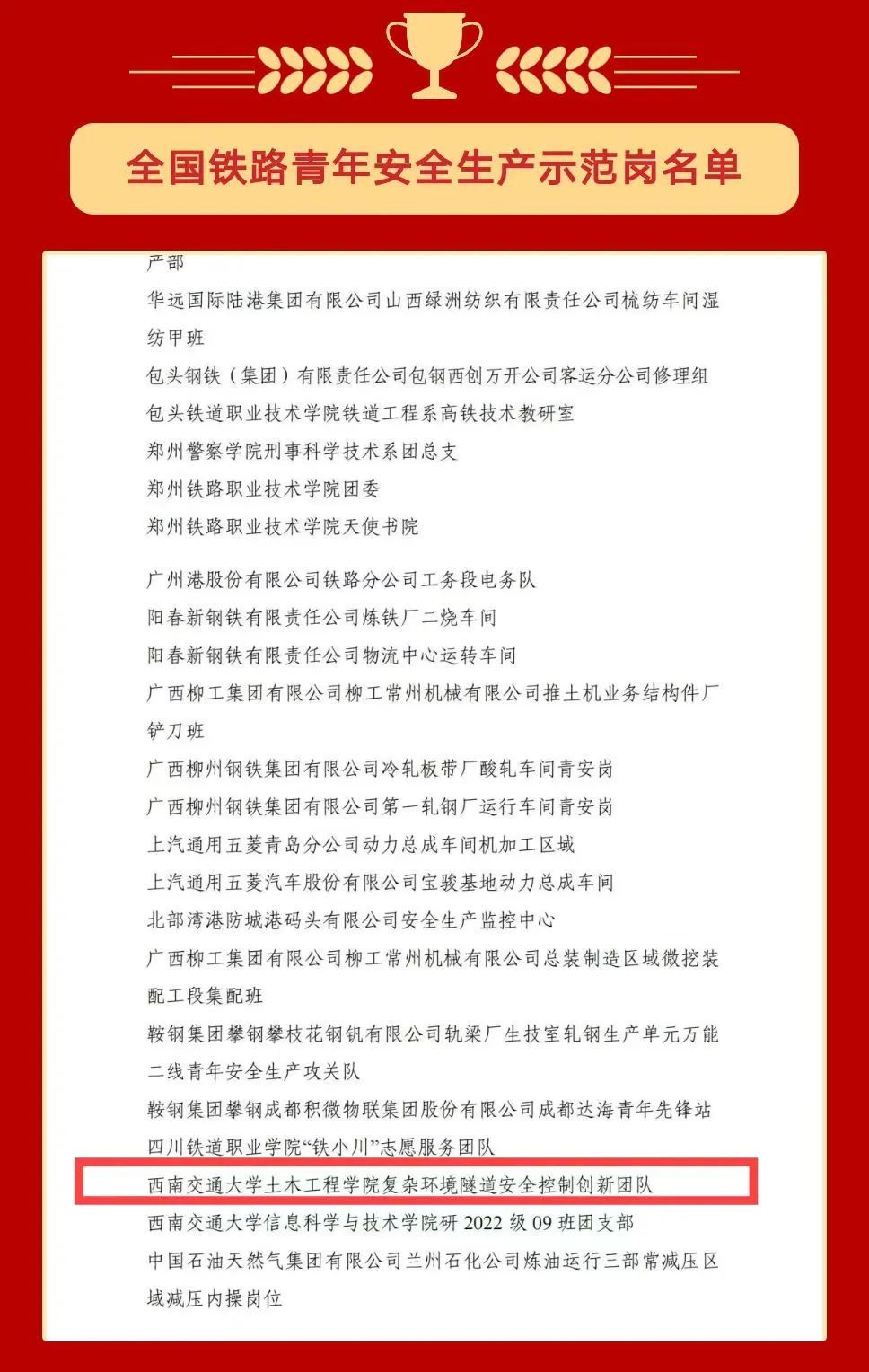 为树立典型,激励奋进,进一步促进青年成长成才,经全国铁道团委评审决定,西南交通大学土木工程学院复杂环境隧道安全控制创新团队荣获“全国铁路青年安全生产示范岗”。