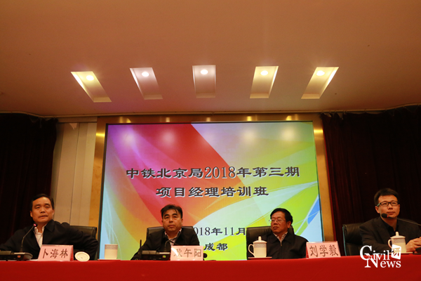 中铁北京工程局2018年第三期项目经理培训班结业典礼于11月5日下午在九里校区土木工程学院举行。中铁北京工程局集团有限公司副总经理耿午阳、人力资源部(党委干部部)部长卜海林、土木工程学院党委书记刘学毅、院长助理占玉林、继续教育中心全体老师参加了结业典礼,结业典礼由卜海林部长主持。