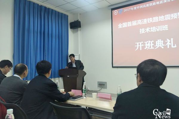 在中国铁路总公司的关心和支持下,经过精心筹备,全国首届高速铁路地震预警系统技术培训班开班典礼于2017年11月21日上午8点在西南交通大学隧道研发大楼101室举行。中国铁路总公司科信部副主任张志方、协调处副处长熊杰,西南交通大学副校长张文桂、土木工程学院院长蒲黔辉、土木工程学院党委书记刘学毅、高速铁路防灾减灾技术研究院常务副院长杨长卫,中国铁道科学研究院首席研究员张格明、研发中心室主任宣言,中铁二院通号院副院长肖琨、旷古公司技术部部长刘超,四川交大工程检测咨询有限公司副总经理李晓斌,四川西南交大铁路发展股份有限公司董事长王鹏翔,隔而固(青岛)振动控制有限公司总经理尹学军,珠海市泰德企业有限公司董事长周超,河南辉煌科技股份有限公司总裁助理郭志国及来自不同铁路局的学员等二十余家单位的领导和代表出席了此次开班典礼。开班典礼由高速铁路防灾减灾技术研究院常务副院长杨长卫主持。