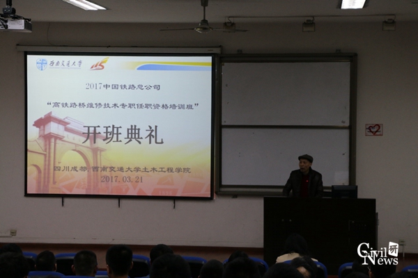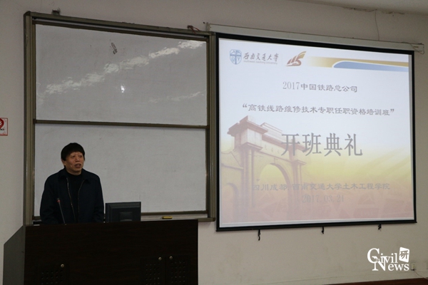 2017年3月21日早上8:30,2017年中国铁路总公司“高铁路桥维修技术专职任职资格培训班”第一期开班典礼在九里校区信息楼0231教室如期举行。之后9点整,2017年中国铁路总公司“高铁线路维修技术专职任职资格培训班” 第一期开班典礼在九里校区信息楼0222教室顺利举行。土木工程学院副院长任宝良以及培训班老师出席典礼,来自全国各个铁路局的相关领导及员工悉数到场。会议由土木工程学院继续教育中心江富长老师主持。